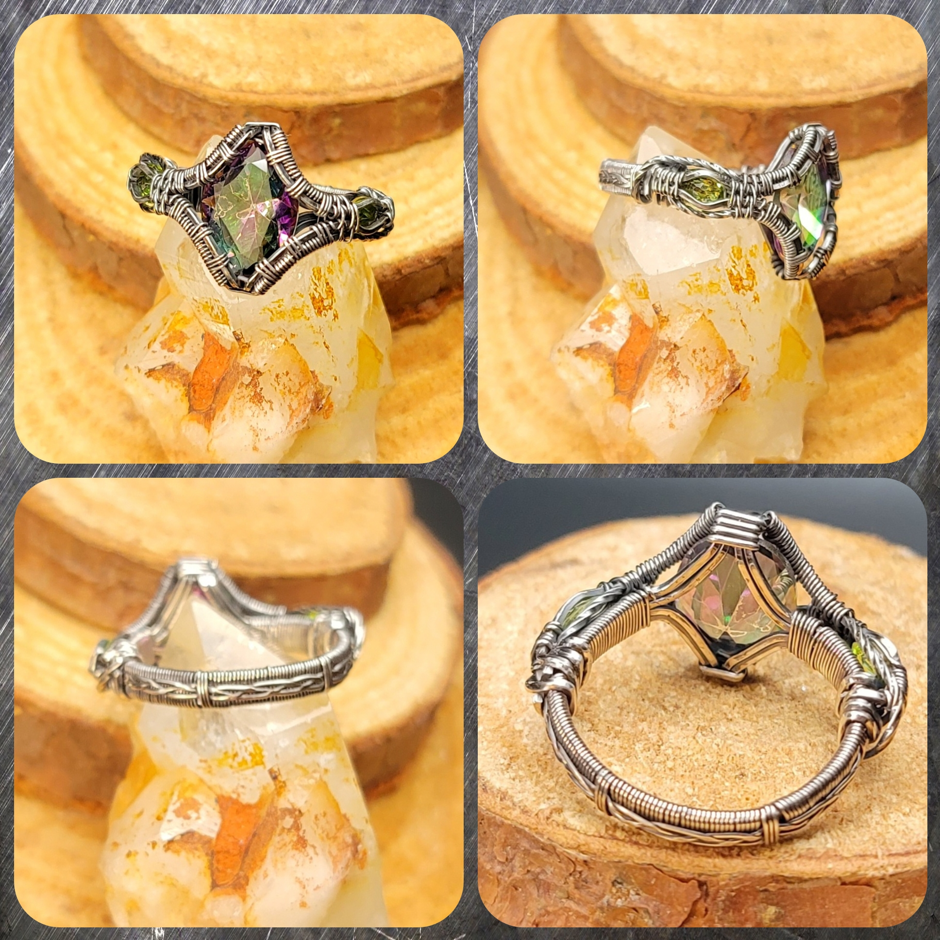 Fall in love with the little details on our stunning Mystic Topaz and Peridot ring. From the intricate band braid to the vibrant gems, every element exudes beauty. Made with sterling silver, this ring is a symbol of elegance and style. Available in size 10.