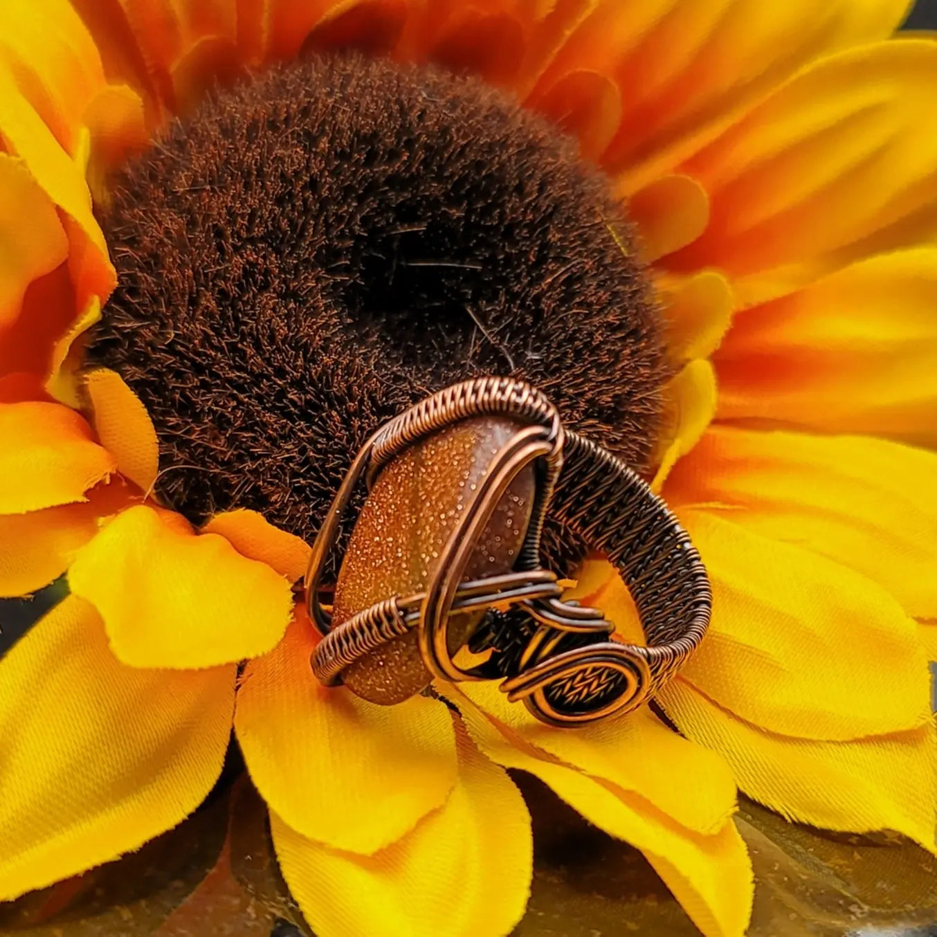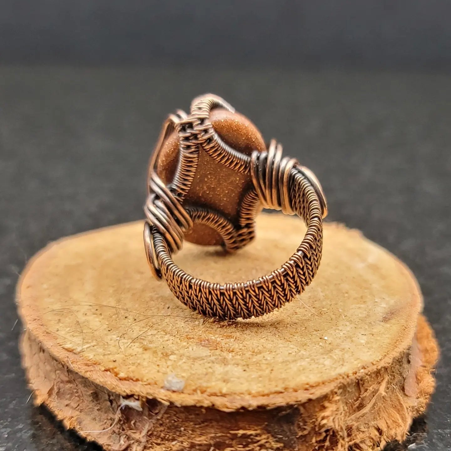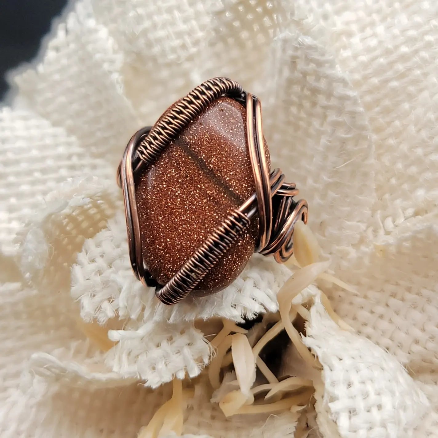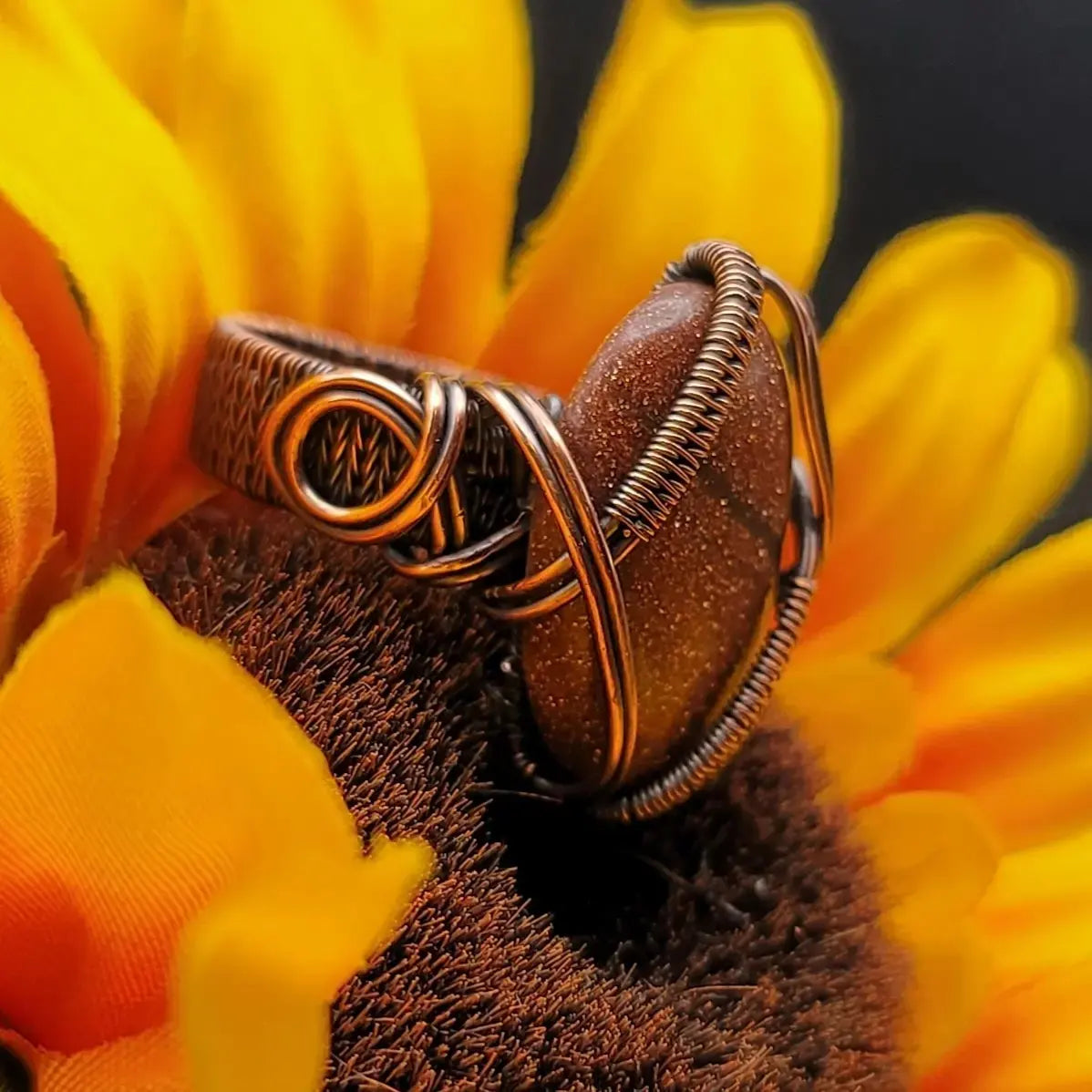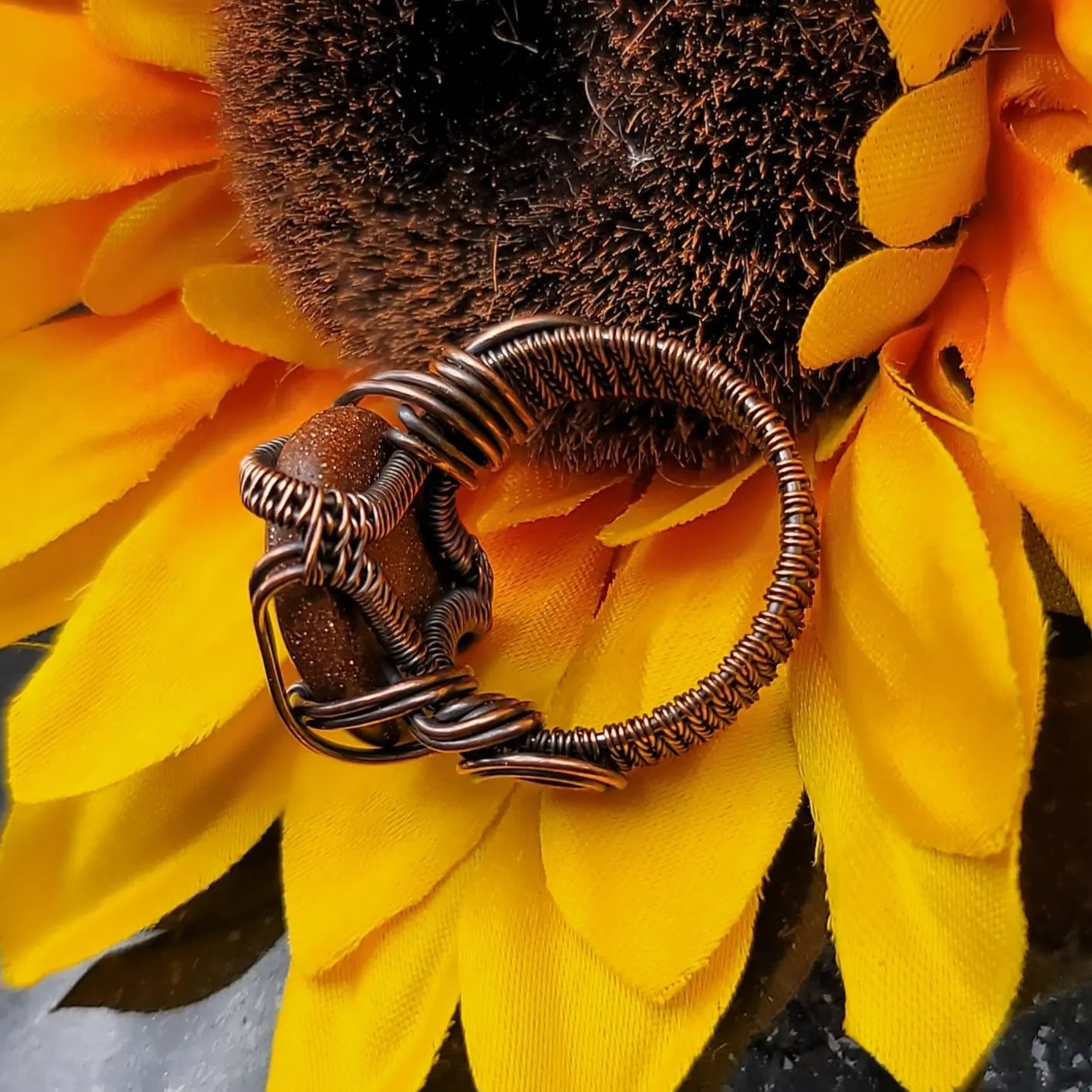 Experience the warmth and radiance of Solas Te (Warm Light) with our stunning Goldstone and copper statement ring. The 7mm wide woven band, oxidized and polished to perfection, beautifully showcases the 20mm x 27mm stone. Add a touch of warmth and sparkle to any outfit with this ring in size 8.